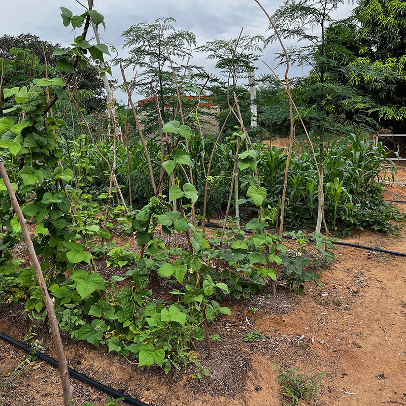 Le système agroforestier de l’APAF (Association pour la Promotion de l’Agroforesterie et de la Foresterie) associe des arbres fruitiers et fertilitaires (légumineuses) plantés à intervalles de 5 m, tandis que les espaces intermédiaires sont utilisés pour le maraîchage. Ce système limite l’érosion, permet la régénération des sols et crée un écosystème riche et diversifié. Notre jardin-forêt a aujourd’hui cinq ans et nous sert à la fois d’espace de détente et de laboratoire vivant.